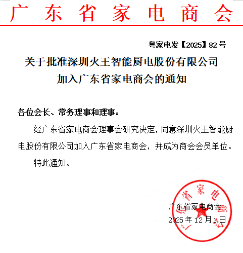 关于批准深圳火王智能厨电股份有限公司加入广东省家电商会的通知