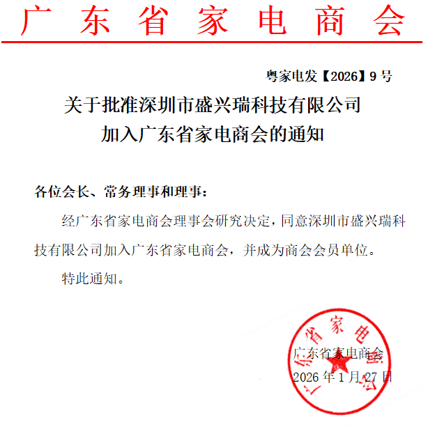 关于批准深圳市盛兴瑞科技有限公司加入广东省家电商会的通知