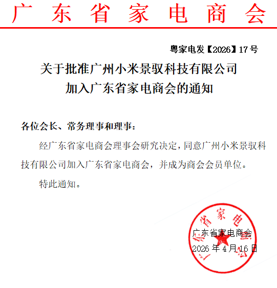 关于批准广州小米景驭科技有限公司加入广东省家电商会的通知