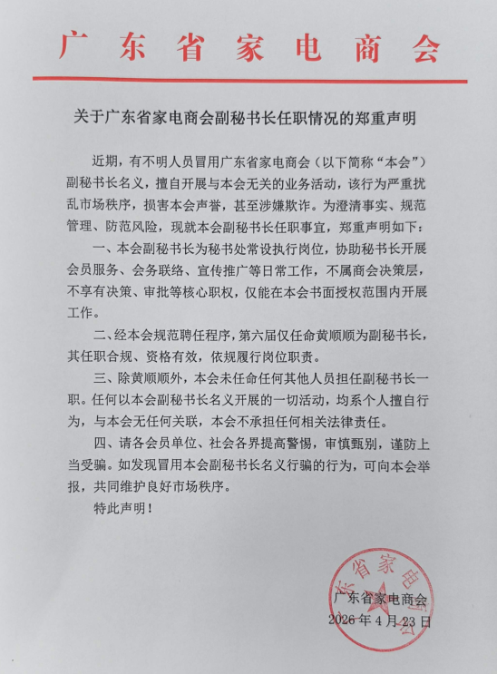 关于广东省家电商会副秘书长任职情况的郑重声明