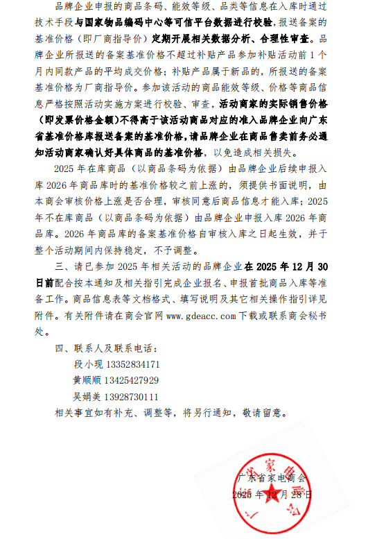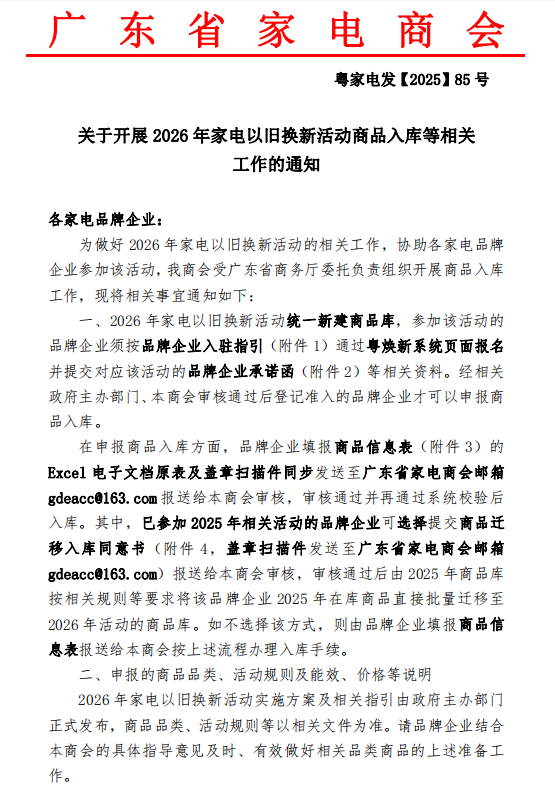 为做好2026年家电以旧换新活动的相关工作,协助各家电品牌企业参加该活动,我商会受广东省商务厅委托负责组织开展商品入库工作,现将相关事宜通知如下。请各企业严格对照本通知要求,落实申报材料准备、商品信息填报等工作,确保申报流程合规、信息真实准确。如有疑问可及时与商会对接,共同保障活动有序开展。